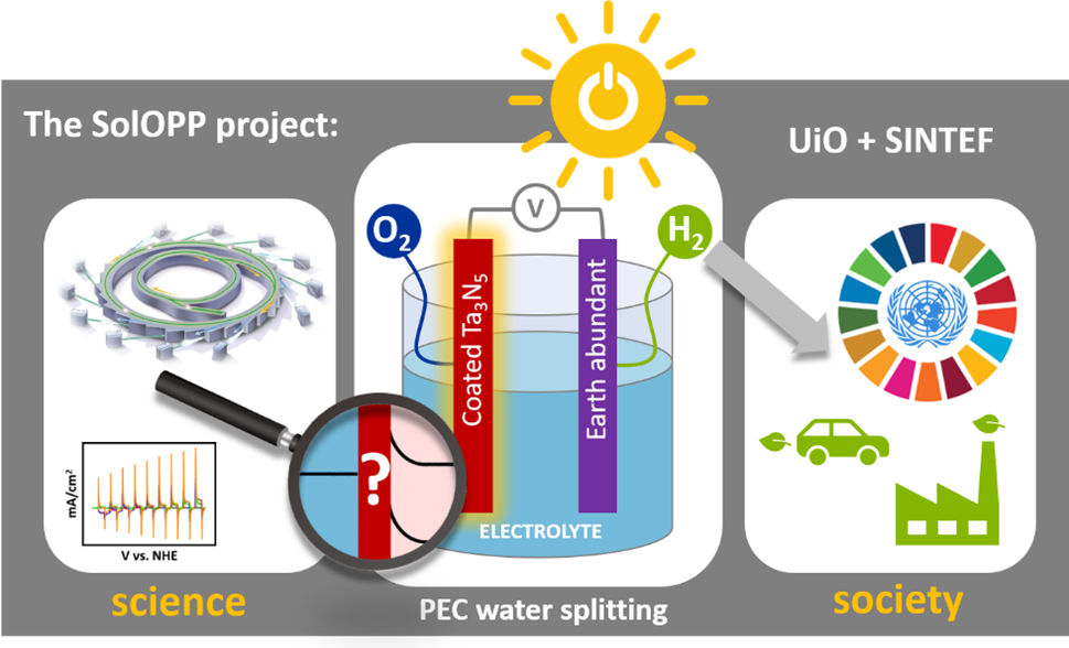 Solar driven water splitting is an elegant way to address the intermittent nature of sunlight by storing it in the form of chemicals bonds, in this case as renewable hydrogen gas. A key component in a light-driven water electrolysis cell is the anode electrode, which must be activated by sunlight and at the same time release oxygen gas by the oxidation of water. The other electrode, the cathode, is responsible for releasing the hydrogen gas by the reduction of water. The primary losses in such photoelectrochemical (PEC) cells come from the anode electrode, as the oxygen evolution reaction (OER) is a complicated four electron reaction and moreover, the oxidative conditions during operation degrade the anode electrode materials. In SolOPP we study and develop a Ta3N5 photo-anode, which is one of the most efficient materials for PEC cells. However, the material degrades over time in contact during PEC water splitting. We will surface modify Ta3N5 with the main aim to increase its durability but also gain fundamental understanding of the corrosion processes during operation. In order to do so, we will set up experiments at international laboratories such as DTU, Lund and Cambridge where we can study the material properties when in contact with water during light exposure and the OER. These experiments will closely resemble the conditions the materials will be exposed to when in use. We can therefore gain insight and extract important knowledge that can be used to further develop a more stable photoanode material.